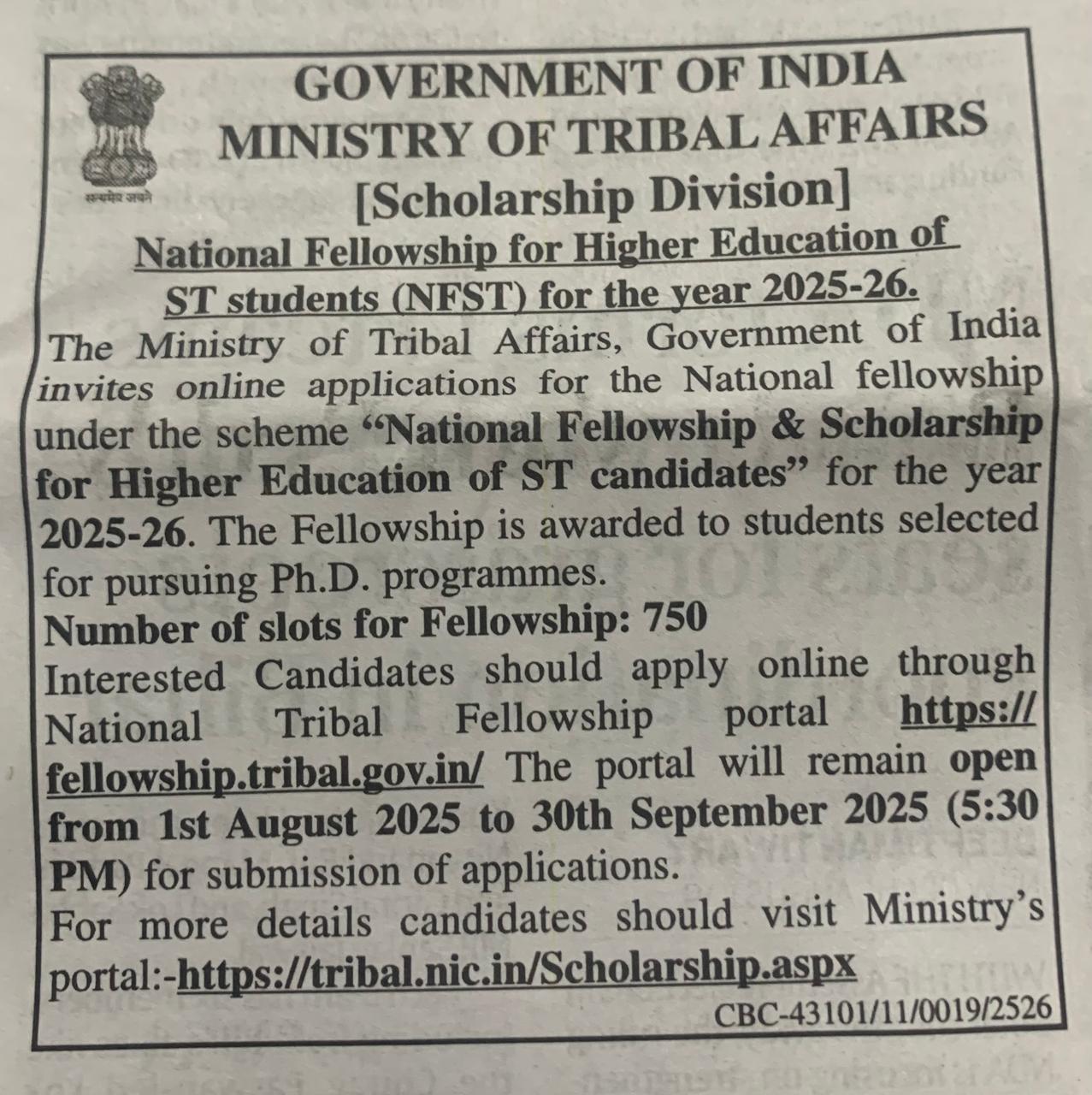 The Ministry of Tribal Affairs, Government of India invites online applications for the National fellowship under the scheme “National Fellowship & Scholarship for Higher Education of ST candidates” for the year 2025-26. The Fellowship is awarded to students selected for pursuing Ph.D. programmes.